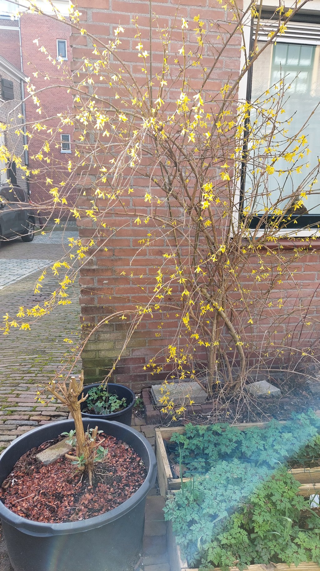 Naast de forsythia staat een vlinderstruik. Vorige week heb ik de struik helemaal teruggesnoeid, waardoor het nu een stompje ogenschijnlijk dood hout is. Er is nog geen spoortje leven te bekennen. Toch weet ik dat het vol leven zit en over een paar maanden zal uitgroeien tot een volle, weelderige struik met prachtige bloemen, waar vlinders en bijen dankbaar op af zullen komen. De forsythia is dan allang niet meer geel, maar veranderd in groen.